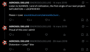 13 octobre 2025 à 09:15 DISTORTION + LOOP annonce.png (fichier) 172 kio Jules (discussion | contributions) Annonce de la sortie du single SUNRIZE / end of civilization par le compte twitter officiel de AEROSOL DELUXE, accompagné de l'annonce du titre de leur projet de premier album : DISTORTION + LOOP. L'auteur du tweet fait d'ailleurs une erreur lors de la rédaction du post, écrivant que l'album serait nommé SATURATION + LOOP. 1